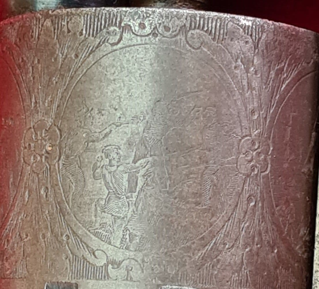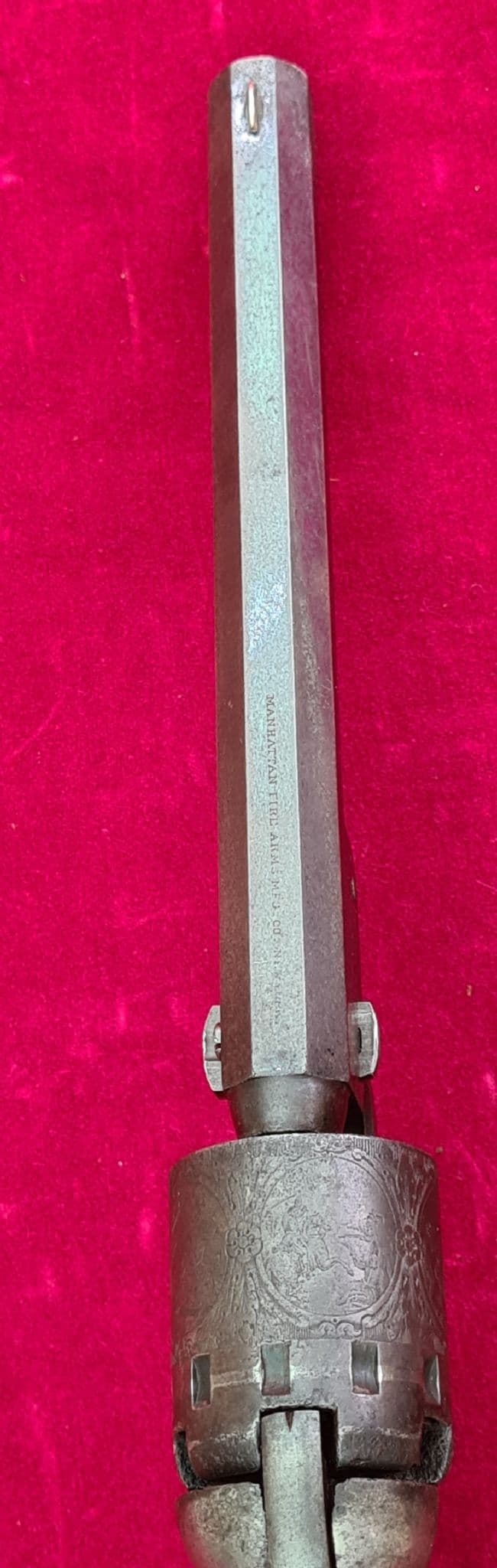 A rare American Manhattan 5 shot .36 calibre Percussion Revolver. Circa 1859. The Manhattan Fire Arms Manufacturing Co. was founded by a group of New Jersey businessmen in 1856. Their goal was to take advantage of Colt’s patent for revolving firearms that was due to expire in 1857. The founders hired Thomas Bacon to become the Superintendent of Manufacturing. The company first began in Norwich, Connecticut and in 1859 moved to Newark, New Jersey. The 6.5 inch octagonal blued barrel marked with the address Manhattan Fire Arms Co MFG. CO New York. The cylinder clearly displaying five scenes within ovals panels with military and naval scenes. All matching serial numbers, serial number indicates that this is the first series produced and with a rare 6.5 inch barrel makes this particular model very scare indeed. Action in good working order. The barrel retaining much of it's original blue and the cylinder scene is very clear. In extremely good overall condition with a few minor dings during it's working life. A fine example of a civil war era first production Manhattan percussion revolver with a 6.5 inch barrel. Ref 3863.